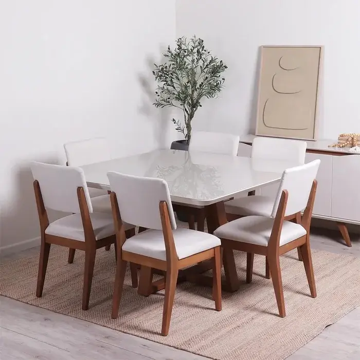 Conjunto de Jantar Mesa Quadrada com Vidro Bennett 6 Cadeiras Ella - Natural C/